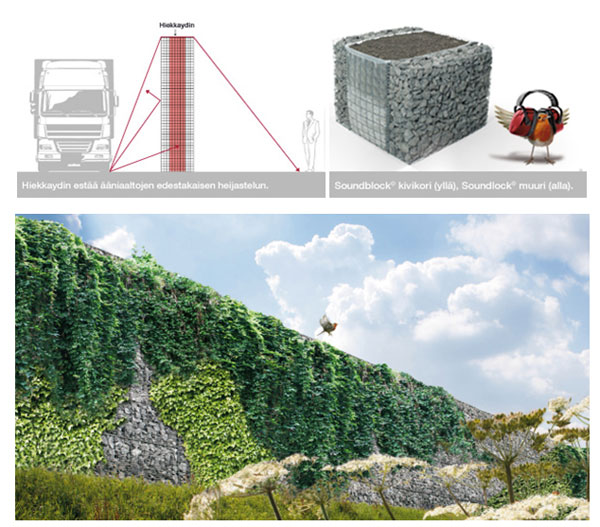 Soundblock on tehokkaasti ääntä eristävä kivikoriratkaisu. Se soveltuu erinomaisesti esimerkiksi teiden varsille liikennemelua eristäviin rakennelmiin. Korin ydin täytetään hiekalla ja uloin kerros naamioidaan kiviaineksella, jonka ansiosta seinä mukautuu kauniisti maisemaan.