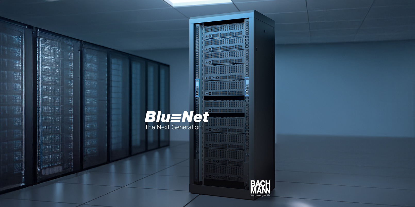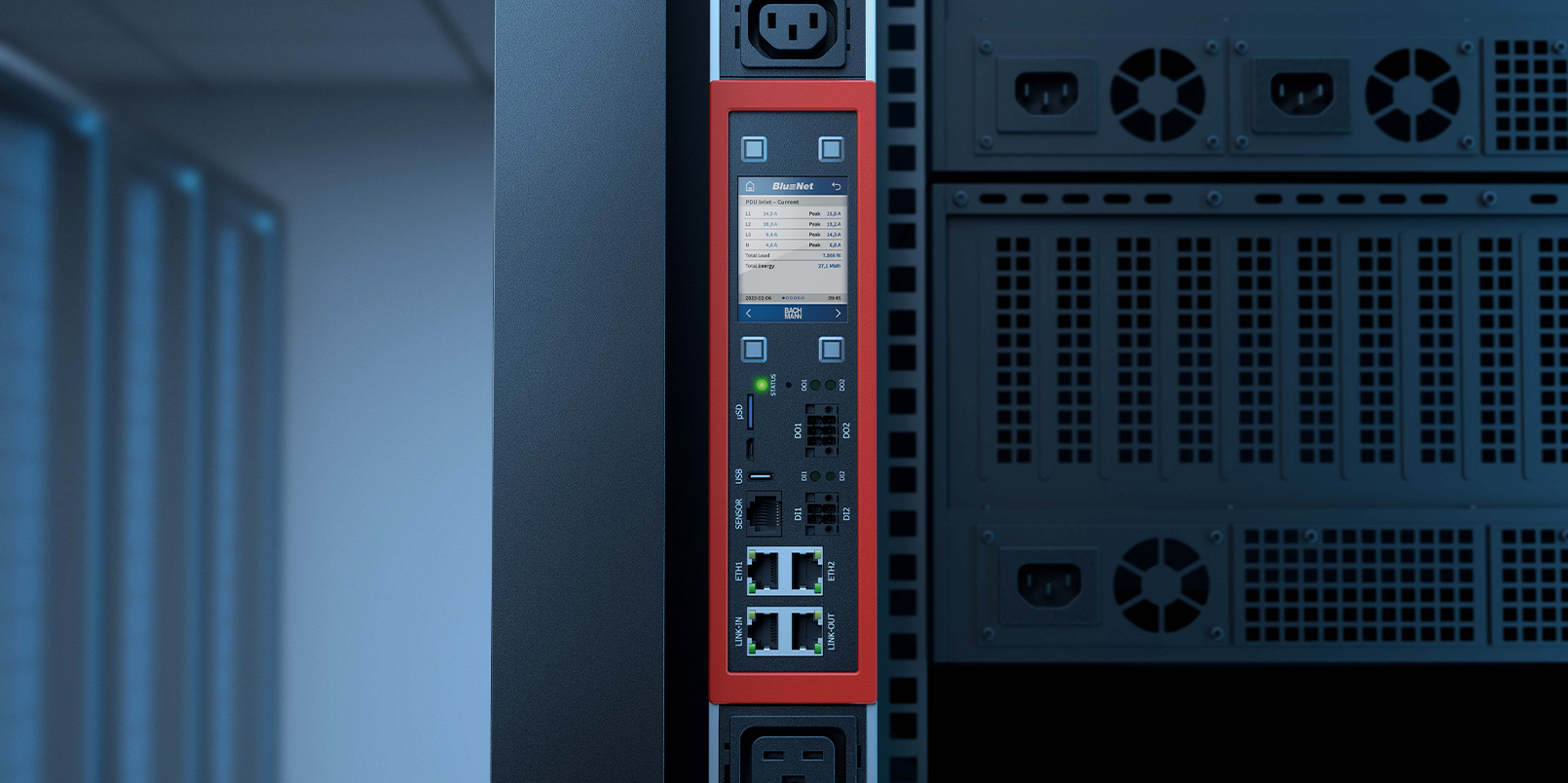 Bachmannin laajassa IT PDU-valikoimassa saatavilla myös älykkäitä ja kustannustehokkaita BlueNet-tuotesarjan ratkaisuja sekä 19” koossa, että pidempinä vertikaaliseen asennukseen tarkoitettuina versioina. Ratkaisu on ihanteellinen osoittamaan paikallisesti valaistulta mittausarvonäytöltä useita eri arvoja. Samoja mittausarvoja voidaan myös lukea ja tallentaa verkon yli.