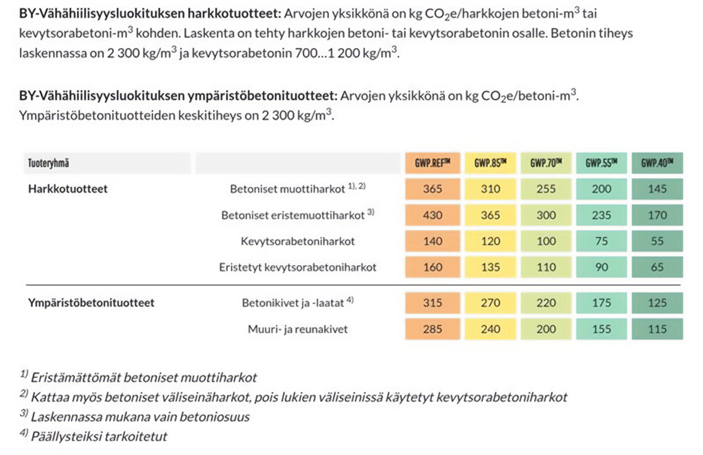 BY-Vähähiilisyysluokituksen tarkoituksena on luoda alalle tuotemerkeistä riippumaton, yhtenäinen tapa kuvata erilaisia vähähiilisempiä betonilaatuja. Vähähiilisyysluokat merkitään tunnuksella: GWP.NN. GWP-tunnus tulee sanoista Global Warming Potential. Tunnuksessa NN on päästötaso verrattuna referenssitasoon. Esimerkiksi GWP.85® tarkoittaa, että betonin hiilidioksidipäästöt ovat korkeintaan 85 % verrattuna referenssitasoon. Harkkojen ja ympäristöbetonituotteiden osalta referenssitaso vastaa alan keskimääräistä päästötasoa vuonna 2021. Lammilla nyt lasketut vähähiiliset päästöarvot ovat vuoden 2025 toteutuneiden valmistusmäärien ja -reseptien mukaisia.