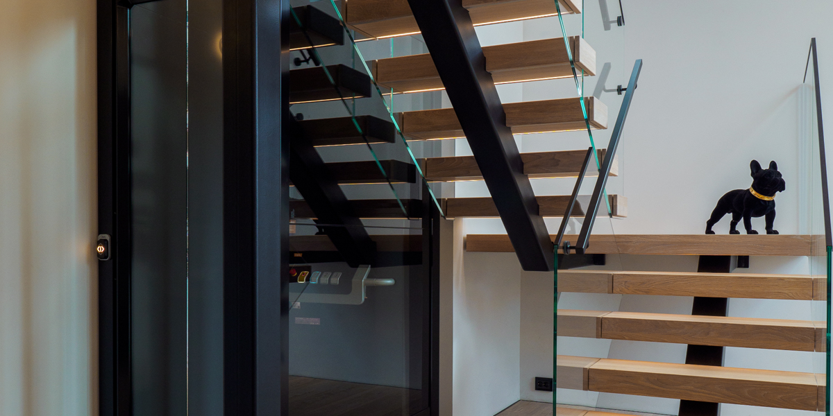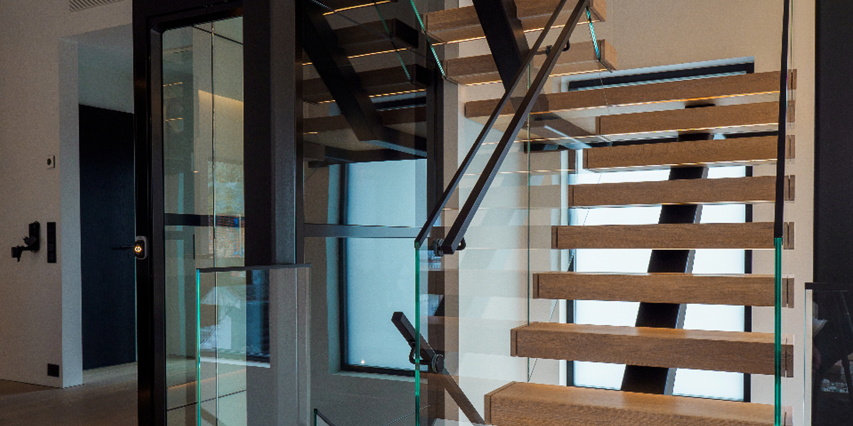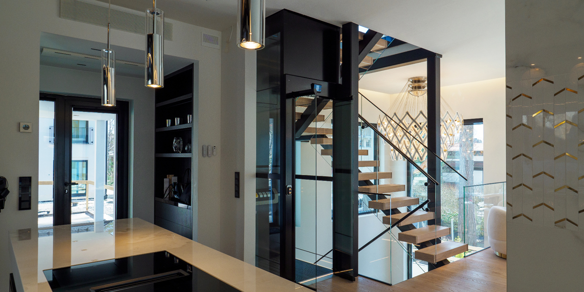 Asunnossa on esimerkiksi keittiö toisessa kerroksessa, jolloin ruokakassien kantaminen keittiöön helpottuu kotihissin avulla. Hissi saatiin suunnitteluvaiheessa sovitettua hienosti keskeiseen paikkaan, josta hissillä matkustaessa on hienot näkymät ja lasisen kuilurakenteensa sekä lasisten pariovien ansiosta hissi istuu huomaamattomasti muuhun sisustukseen.