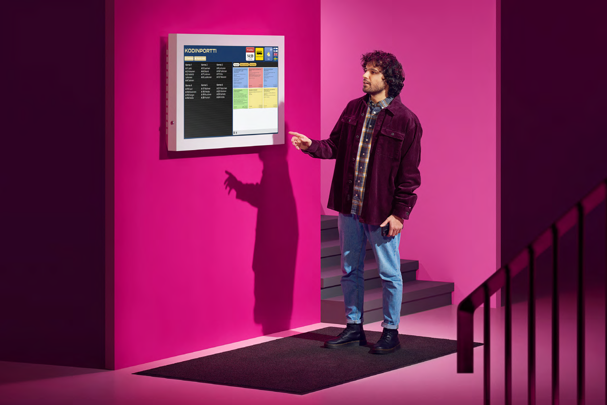 Moderni asukasviestinnän ratkaisu Kodinportti toimii selaimen ja mobiilisovelluksen lisäksi myös digitaalisella porrasnäytöllä. Se korvaa perinteiset paperilaput, ilmoitustaulut sekä ajanvarausvihot. Porrasnäyttö tarjoaa tavanomaisen infon lisäksi myös esimerkiksi päivän sään ja paikallisliikenteen tietoja. Kodinportti ei vaadi suuria investointeja ja on käyttökustannuksiltaan edullinen. Samalla taloyhtiön arvo nousee ja asuminen on entistä sujuvampaa.