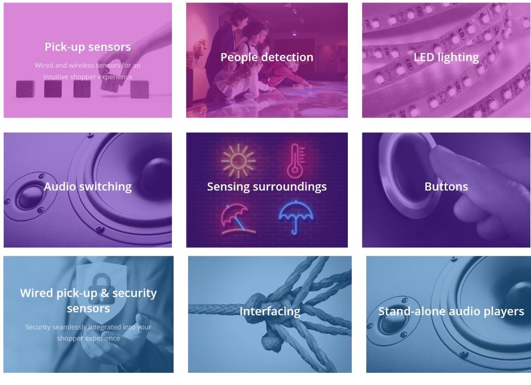 Mediatoistimiin saa kytkettyä paljon erilaisia Nexmosphere interaktiivisia liike/paino/etäisyys/huitaisu/kosketus tunnistimia, ledivaloja ja painikkeita sekä DMX laitteisiin.