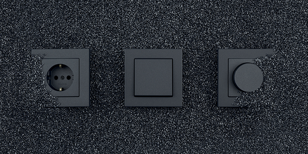 Tuotannossamme olemme jo vuosia luottaneet kierrätysmuoviin. A CREATION-, A 550-, A CUBE- ja A FLOW -kytkinsarjat mattamustana koostuvat jo 95-prosenttisesti luonnonvaroja säästävästä kierrätysmateriaalista. Näin edistämme muovijätteen ympäristökuormituksen vähentämistä. Kierrätysmateriaali on muovijätteen käsittelystä ja kierrätyksestä saatava materiaali. Kierrätysprosessissa jätteet kerätään, lajitellaan, puhdistetaan ja murskataan mekaanisesti. Materiaali sulatetaan ja jalostetaan ekstruusioprosessissa (puristusmenetelmällä) kierrätysmateriaaliksi DIN ISO 14021 -standardin mukaisesti.