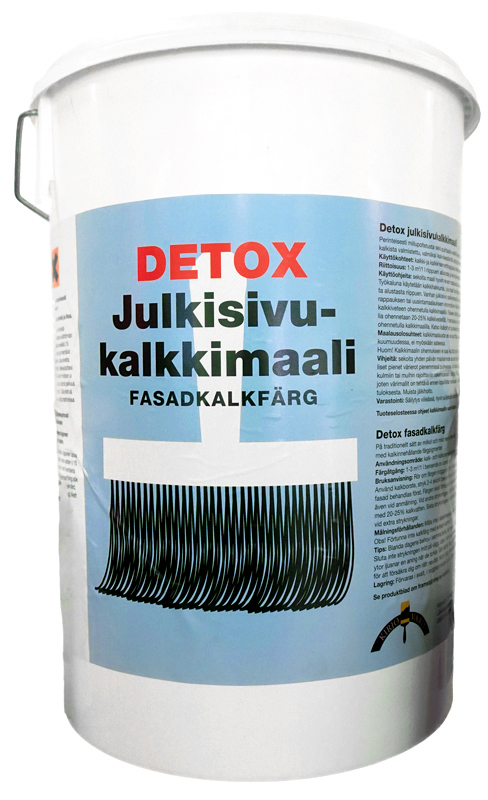 Detox-julkisivukalkkimaaliPuhtaasta kalkkikivestä, perinteisesti miilupoltetusta sammutetusta Vanhan Miehen hautakalkki tahnasta valmistettu kalkkimaali. Kalkkimaali sävytetään kalkin emäksisyyden kestävillä väripigmenteillä, kuten esimerkiksi rautaoksidit, umbrat, terrat, okrat ym. "maavärit" |