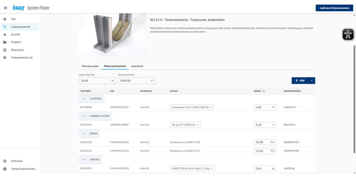 Kuvassa näkyvä ”Materiaaliluettelo” välilehti antaa sinulle puolestaan mahdollisuuden syöttää tarvitsemasi neliömäärät ja haluamasi jätteen määrän (oletuksena 10%). Syöttämiesi tietojen perusteella järjestelmä laskee sinulle tarvittavat materiaalimäärät tuotenumeroineen. Voit lisäksi ladata materiaaliluettelon näkymän PDF-tiedostona ulos järjestelmästä esimerkiksi tehdäksesi tilauksen Knauf myyntiin. Järjestelmän ”Lataukset” välilehdeltä pääset puolestaan lataamaan esimerkiksi rakennekuvan PDF-muotoisena dokumentaatiota varten tai tallentamaan rakenteesi tiedot määrineen suunnitelmiasi varten.