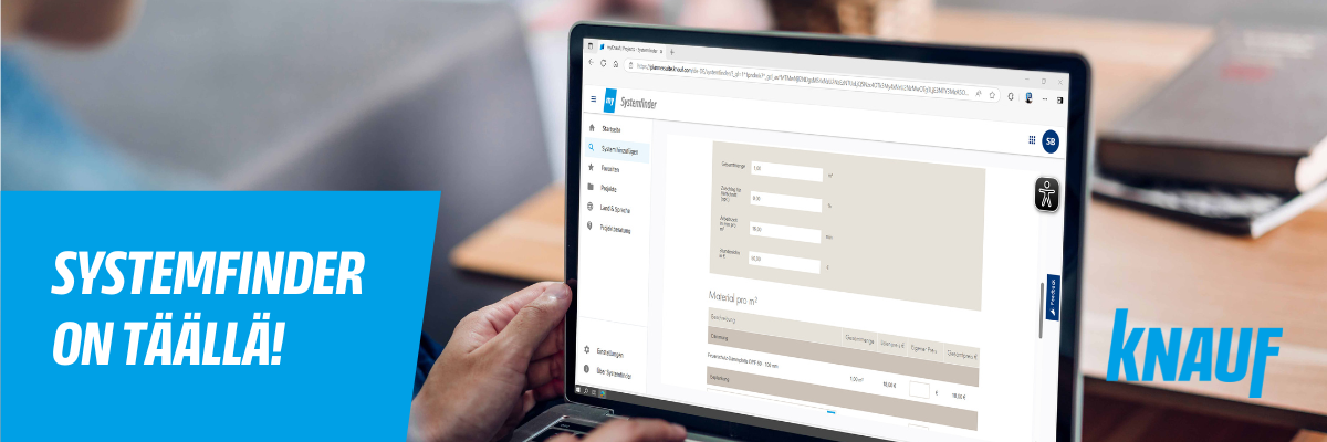 Knauf on julkaissut Systemfinder-työkalun lokakuussa. Järjestelmä kokoaa yhteen käytännössä väliseinäesitteemme tiedot ja vielä enemmän, jotta suunnittelijan työ tuotteitamme hyödyntäen olisi entistä helpompaa. Työkalun käyttäminen on helppoa ja ilmaista, eikä se vaadi kirjautumista. Voit siis kokeilla työkalua vaikka heti osoitteessa: