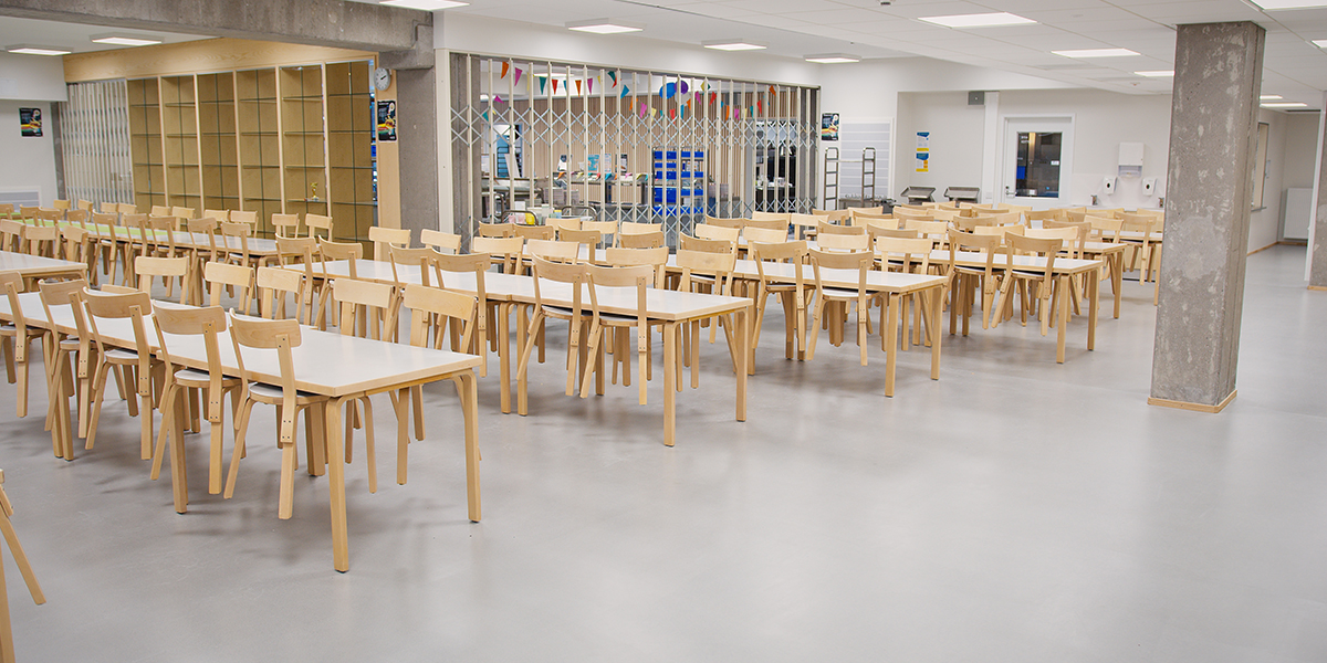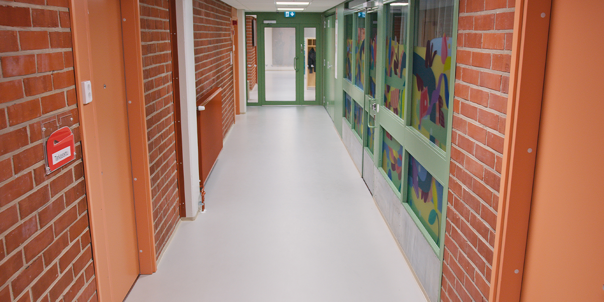 Käytäviin ja luokkatiloihin haettiin tuotetta, joka kestää kulutusta, on pinnaltaan miellyttävä liikkua ja oleskella ja on tehokas ääneneristyksen kannalta.