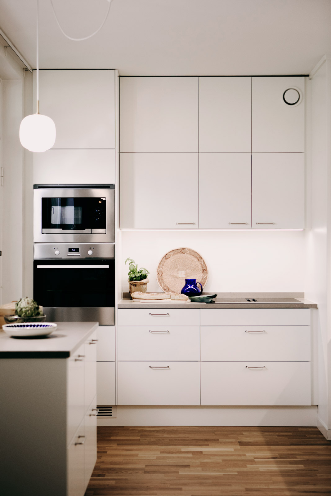 Tummat ovet vaihdettiin lämpimän valkoisiin, mikä teki keittiöstä huomattavasti valoisamman ja tilavamman. Myös tähän keittiöön lisättiin saareke, joka paransi tilan käytettävyyttä ja toi lisää säilytys- ja laskutilaa.