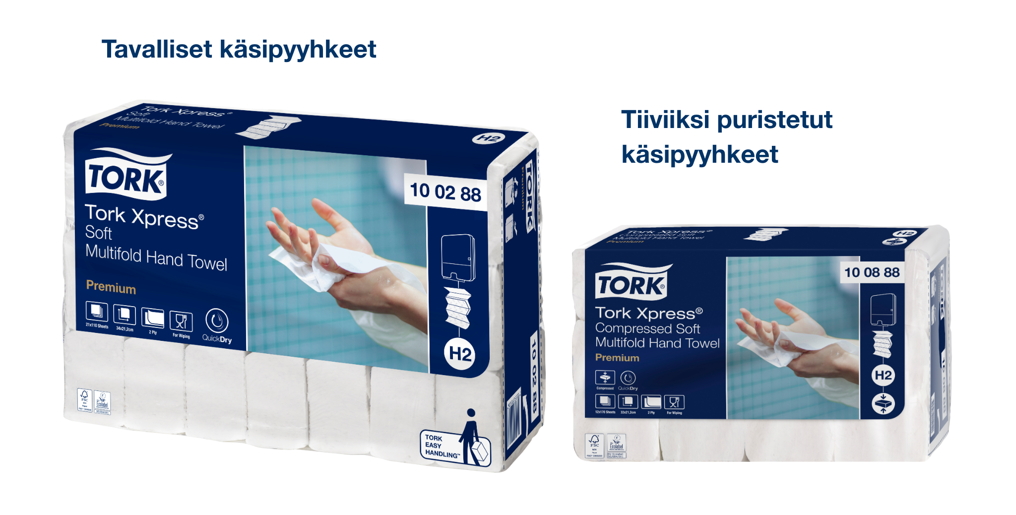 Tiiviimmät käsipyyheniput vapauttavat tilaa muuhun käyttöön, helpottavat siivousvaunujen käyttöä ja lisäävät jo olemassaolevien käsipyyheannostelijoiden kapasiteettia. Kun annostelijaan mahtuu kerralla kaksinkertainen määrä paperia², paperia riittää pidempään, täyttökertojen määrä vähenee ja aikaa vapautuu muihin tehtäviin.