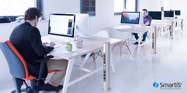 SmartiS-pistorasiapylväiden avulla sähkö, tele ja data voidaan turvallisesti siirtää sinne, missä niitä tarvitaan. Pistorasiapylväiden ansiosta seinäpistorasiat eivät rajoita työpöytien sijoittelua ja työtila pysyy siistinä, kun johtoja ei kulje pitkin työtilan lattioita.