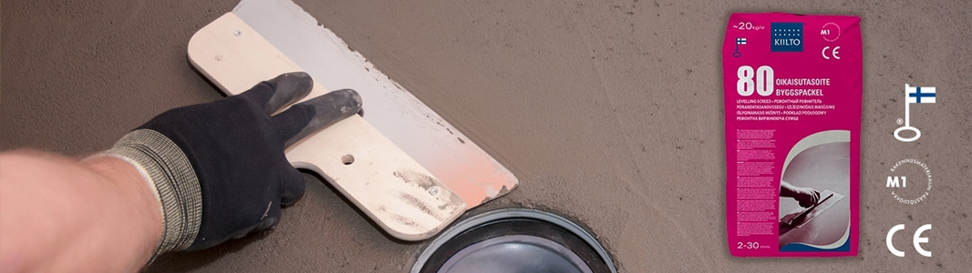 Kiilto 80 on M1-luokiteltu ja matala-alkalinen lattioiden oikaisutasoite 2–30 mm kerroksiin sisä- ja ulkotiloissa. Tuote soveltuu erinomaisesti lattioiden kallistusten korjauksiin ja sillä saadaan valmis vedeneristettävä pinta märkätiloissa.