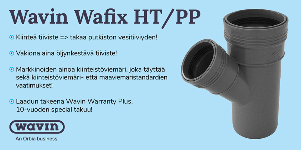 Wafix-viemäreille myönnetään 10 vuoden projektikohtainen järjestelmätakuu, Warranty+. Kysy lisää Wavinin myynniltä.