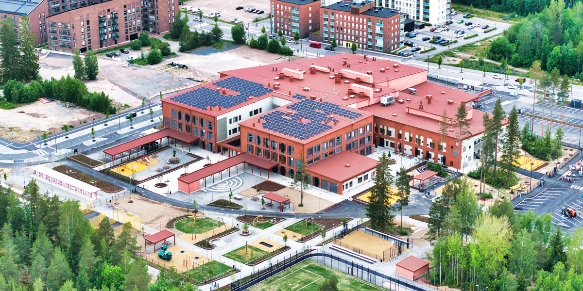 Rykmentinpuiston koulun ja päiväkodin seinät saavat elävyyttä Weberin Kahi® Viisteharkoista. Elinkaarihanke on inspiroiva esimerkki koko rakennusalalle.